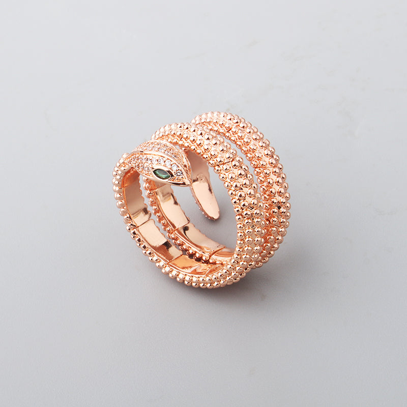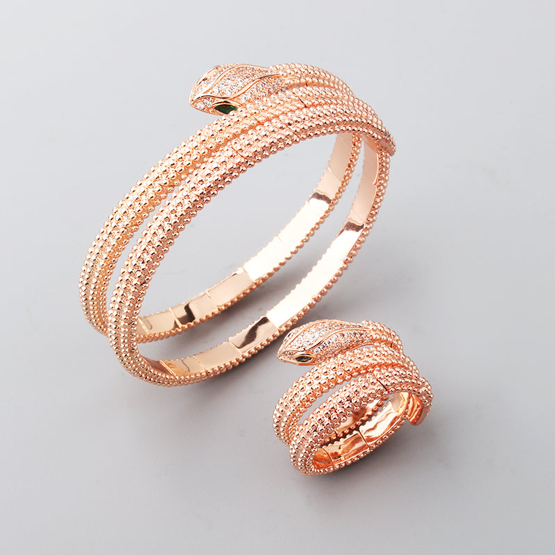 The Bob Snake Viper collection, envisioned by designer Bob, showcases a sophisticated and minimalist approach to the iconic serpent motif. This set, featuring a multi-coil wrap bracelet and matching ring, is finished in a romantic Rose Gold tone that radiates modern elegance. Distinguishing this "No-Diamond" edition is the exquisite beaded texture that covers the serpent's entire body, creating a rich, granular tactile effect that catches the light naturally. The smooth, polished viper heads are accented with piercing emerald-green eyes, adding a singular pop of mysterious color to the warm rose silhouette. Forged from premium medical-grade titanium steel, these pieces offer exceptional durability and a comfortable, skin-safe feel. Please note that the bracelet and ring are sold individually, offering the flexibility to wear them as a solo statement or a coordinated set.