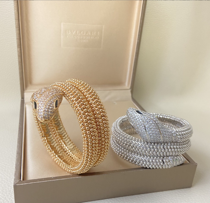 The Lotteds Bob Snake Viper Bracelet is a sophisticated and alluring jewel that symbolizes protection, transformation, and captivating grace. Crafted in luminous White Gold, the bracelet features the iconic Viper modular design, which elegantly coils around the wrist. Its geometrically shaped sections replicate the snake's mesmerizing sinuosity and skin texture, reflecting light with polished brilliance. This White Gold modular bangle offers a powerful yet subtle statement, embodying both artistic tension and deep spiritual meaning.