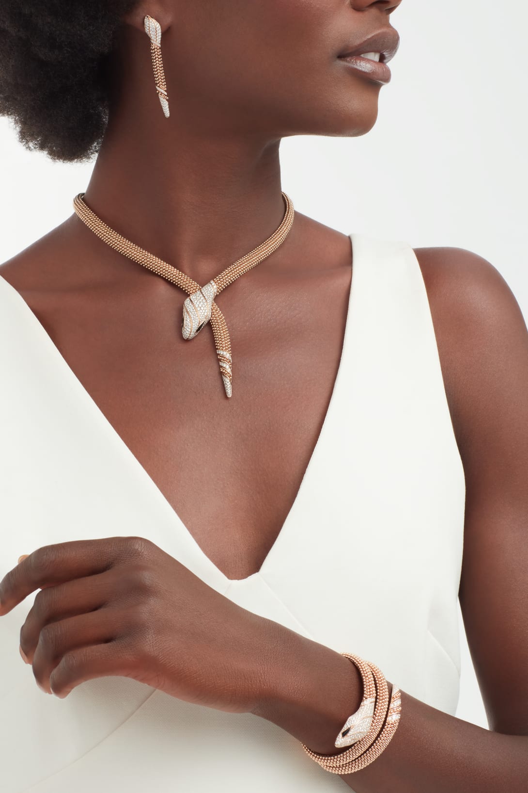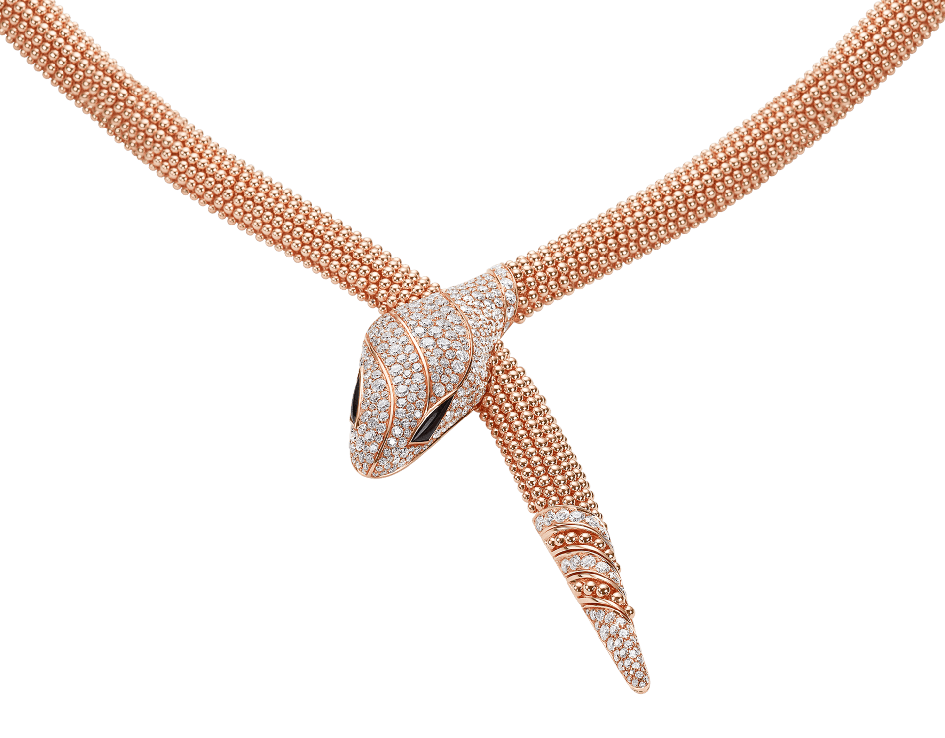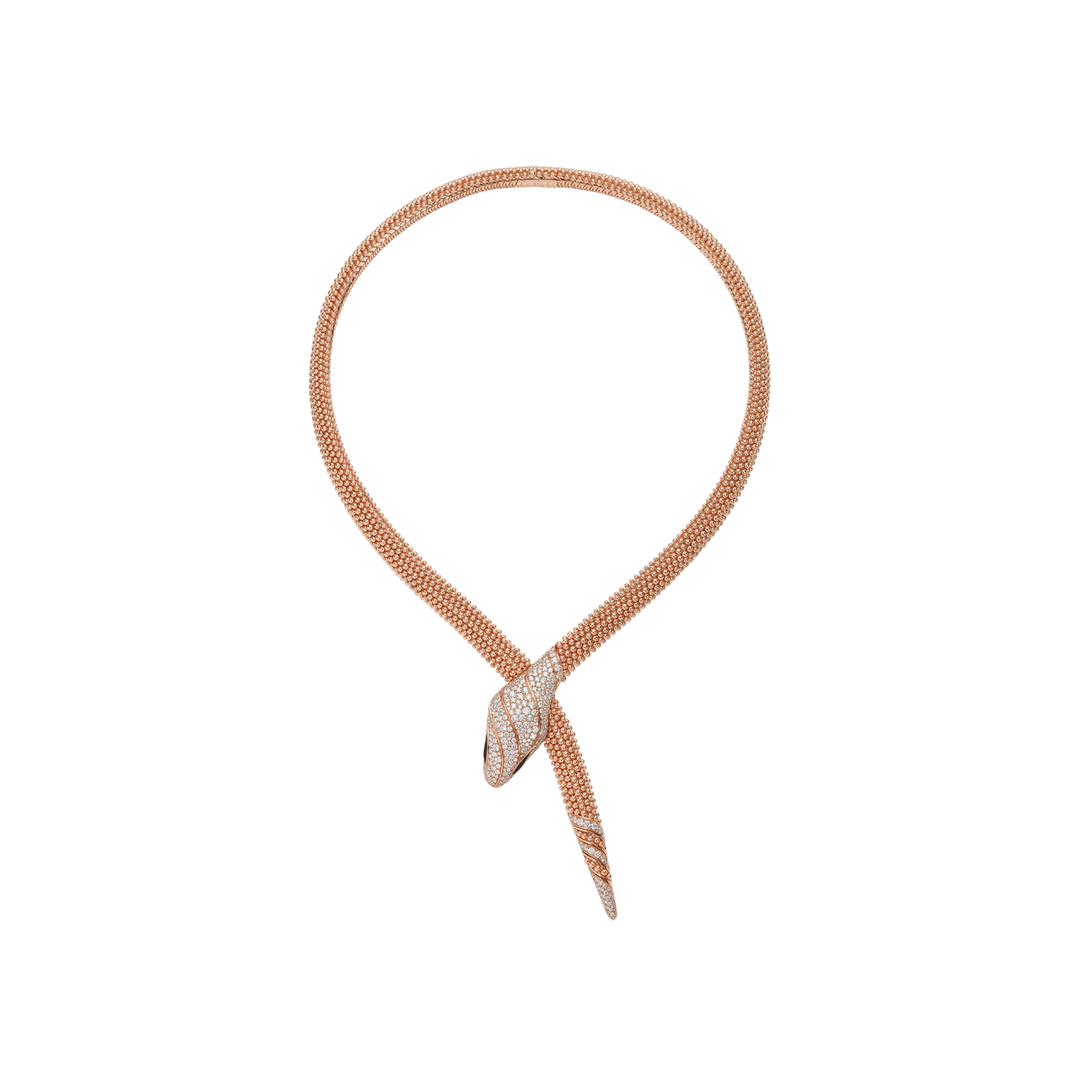 The Lotteds Bob Snake Viper Necklace is a masterpiece of design, embodying potent transformation and magnetic allure. Crafted in glowing Rose Gold plated Sterling Silver, the necklace showcases the iconic Viper design where the serpent’s body is intricately formed by mobile gold beads, offering a fluid, tactile elegance around the neck. The striking snake head is exquisitely set with dazzling Moissanite pavé, creating a brilliant focal point. This statement piece captures deep spiritual meaning and undeniable luxury, perfect for the wearer with distinctive taste.