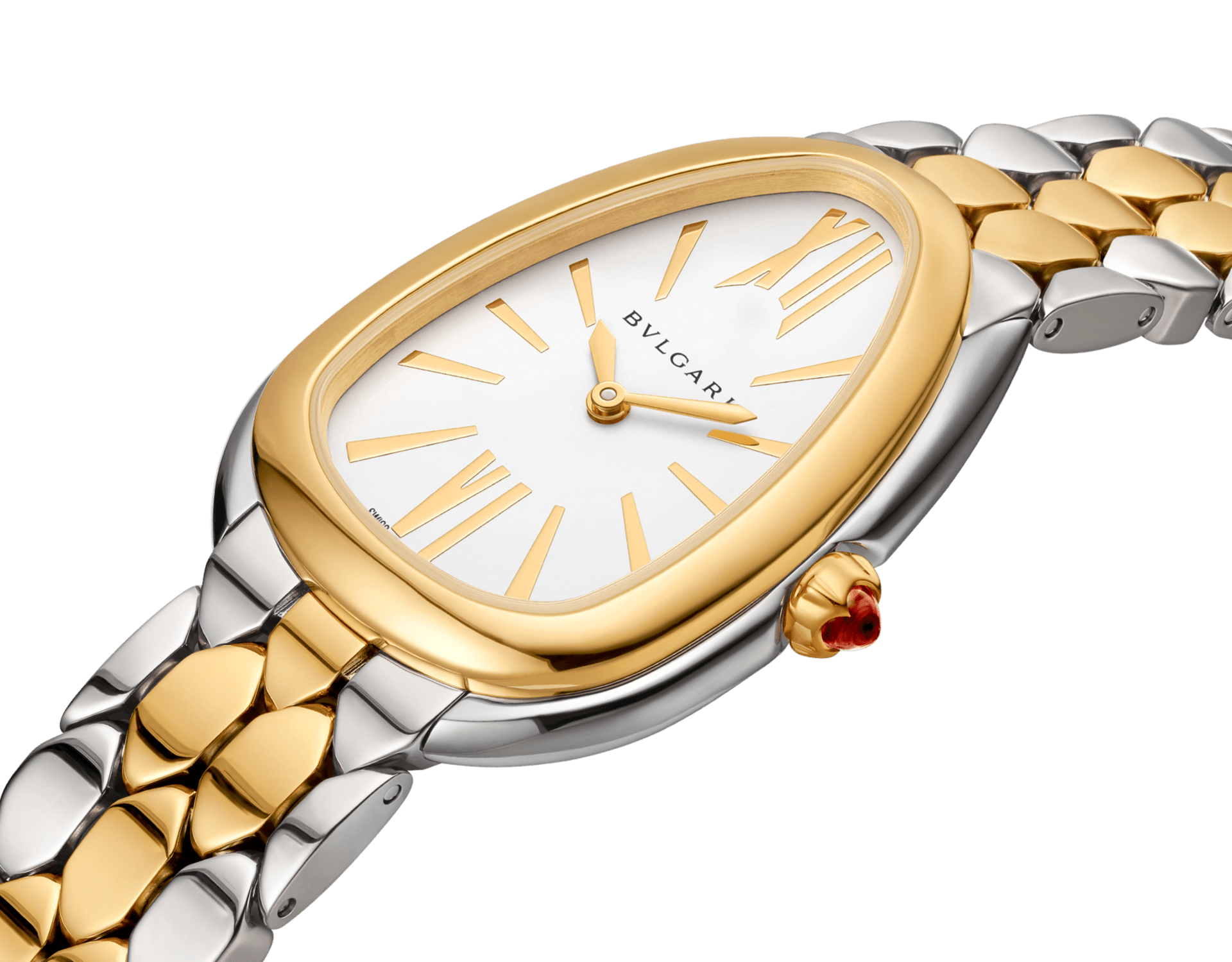 Gleaming with the refined sheen of its materials, the Serpenti Seduttori watch in 18 kt yellow gold and stainless steel makes time even more precious. Reimagining Bvlgari’s icon of seduction with a striking new design, the timepiece boasts the distinctive drop-shaped watch head and a white silver opaline dial. Inspired by the scales of a serpent, its sensual and flexible bracelet features a hexagonal pattern, conjuring the glamour of jewelry through captivating aesthetics.