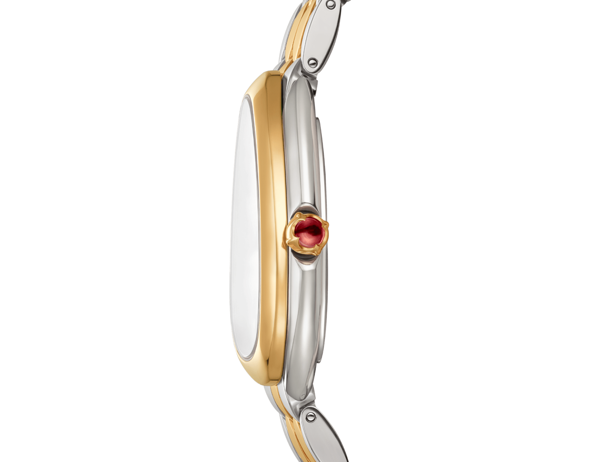 Serpenti Seduttori watch with quartz movement, 33 mm stainless steel case, 18 kt yellow gold bezel, 18 kt yellow gold crown set with a cabochon-cut pink rubellite, white silver opaline dial, stainless steel and 18 kt yellow gold bracelet with folding buckle. Water-resistant up to 30 meters.